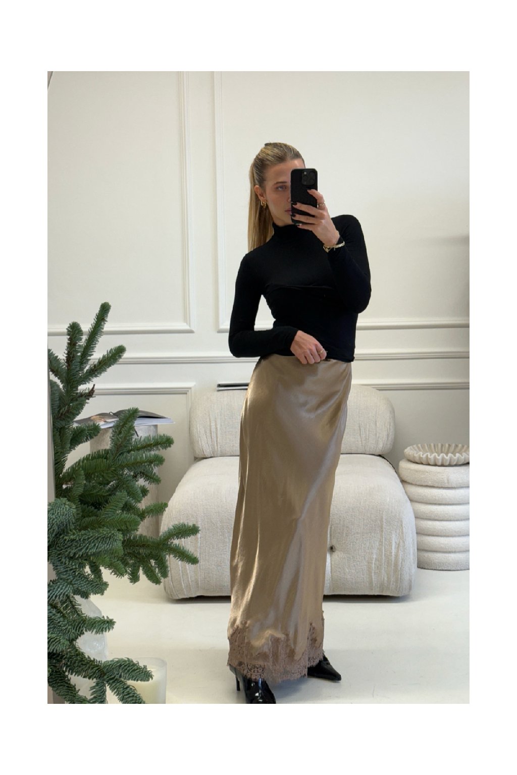 Dlouhá bronzová satin sukně s krajkou ve spodní části